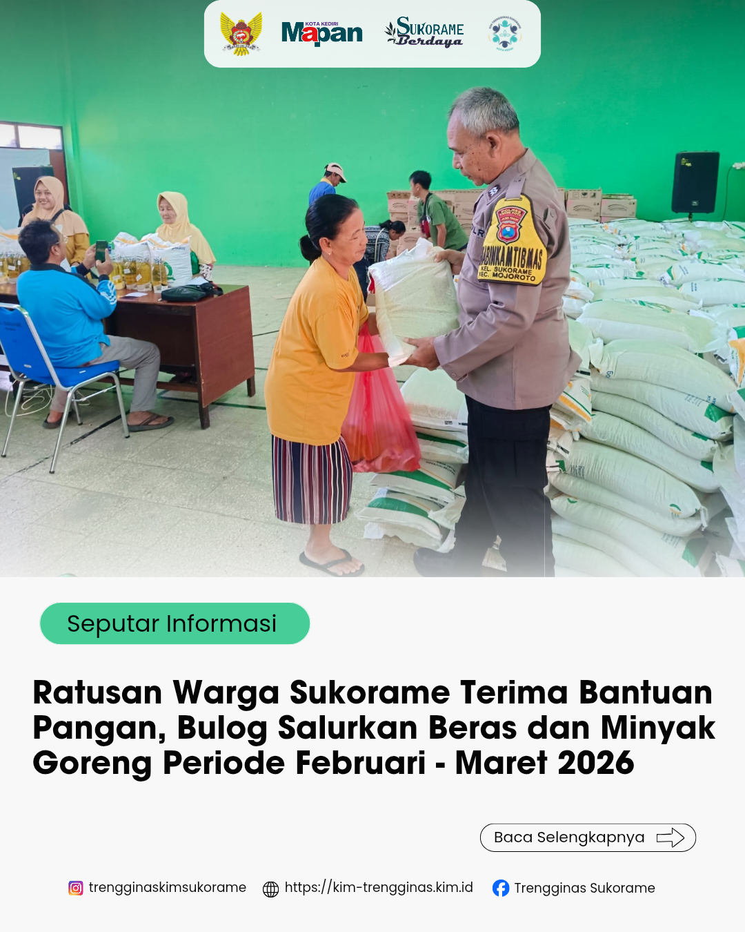 [Sukorame, Kota Kediri] Sebanyak lebih dari 700 warga Kelurahan Sukorame mendapatkan bantuan pangan dari Badan Pangan Nasional (Bapanas) guna menjaga ketahanan pangan keluarga. Bantuan tersebut disalurkan secara langsung melalui Perum Bulog di Gedung Serbaguna Kelurahan Sukorame pada 14-15 Maret 2026.